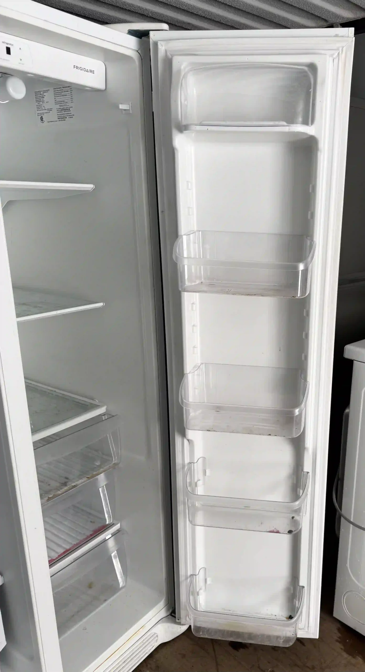 Clean, full-size Frigidaire side-by-side refrigerator ready for daily use. This is a very practical kitchen fridge — narrow enough to fit most homes and apartments but still offers strong storage capacity with organized shelving and door bins.