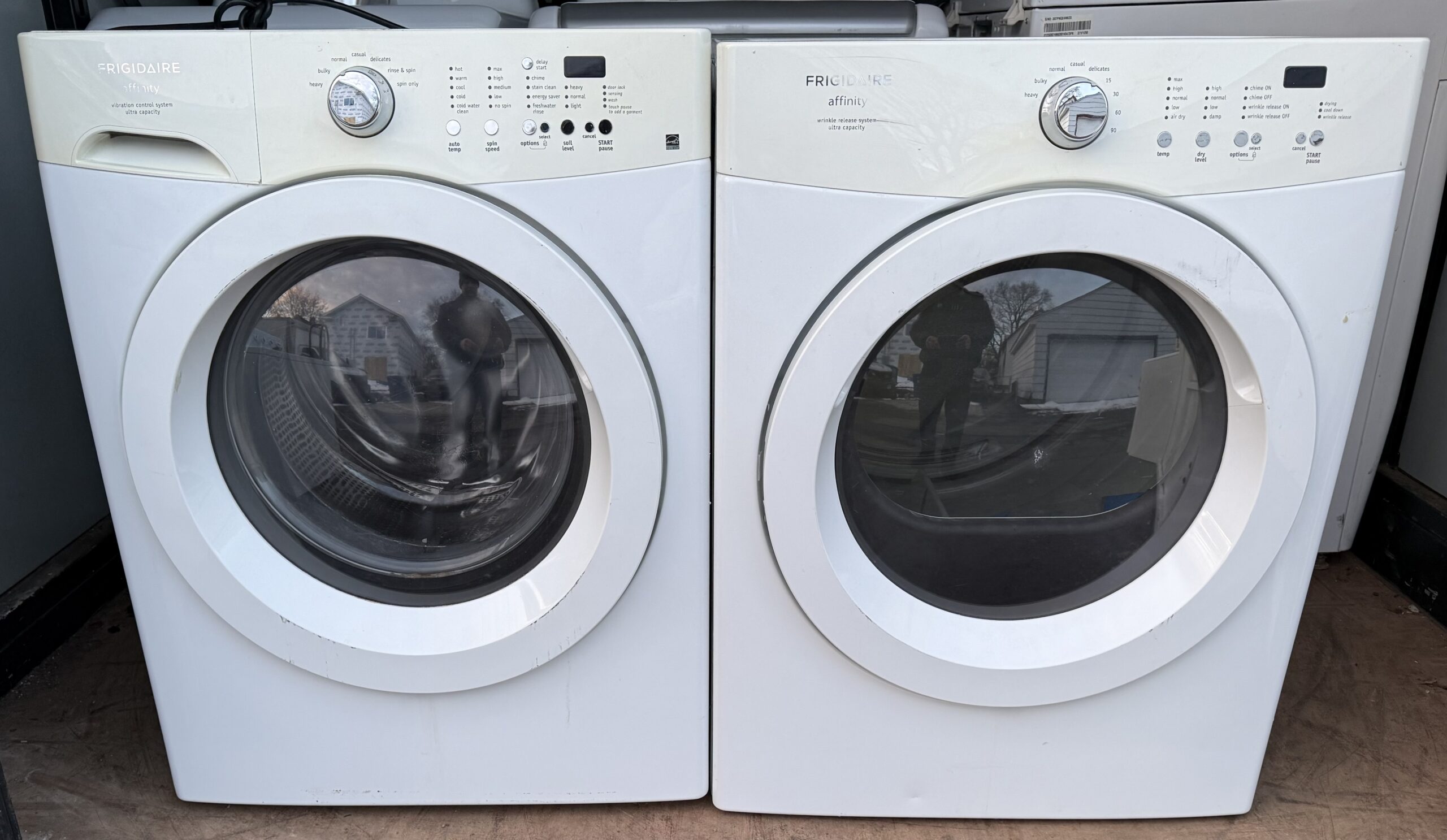 Clean Frigidaire Affinity front-load washer and gas dryer set.