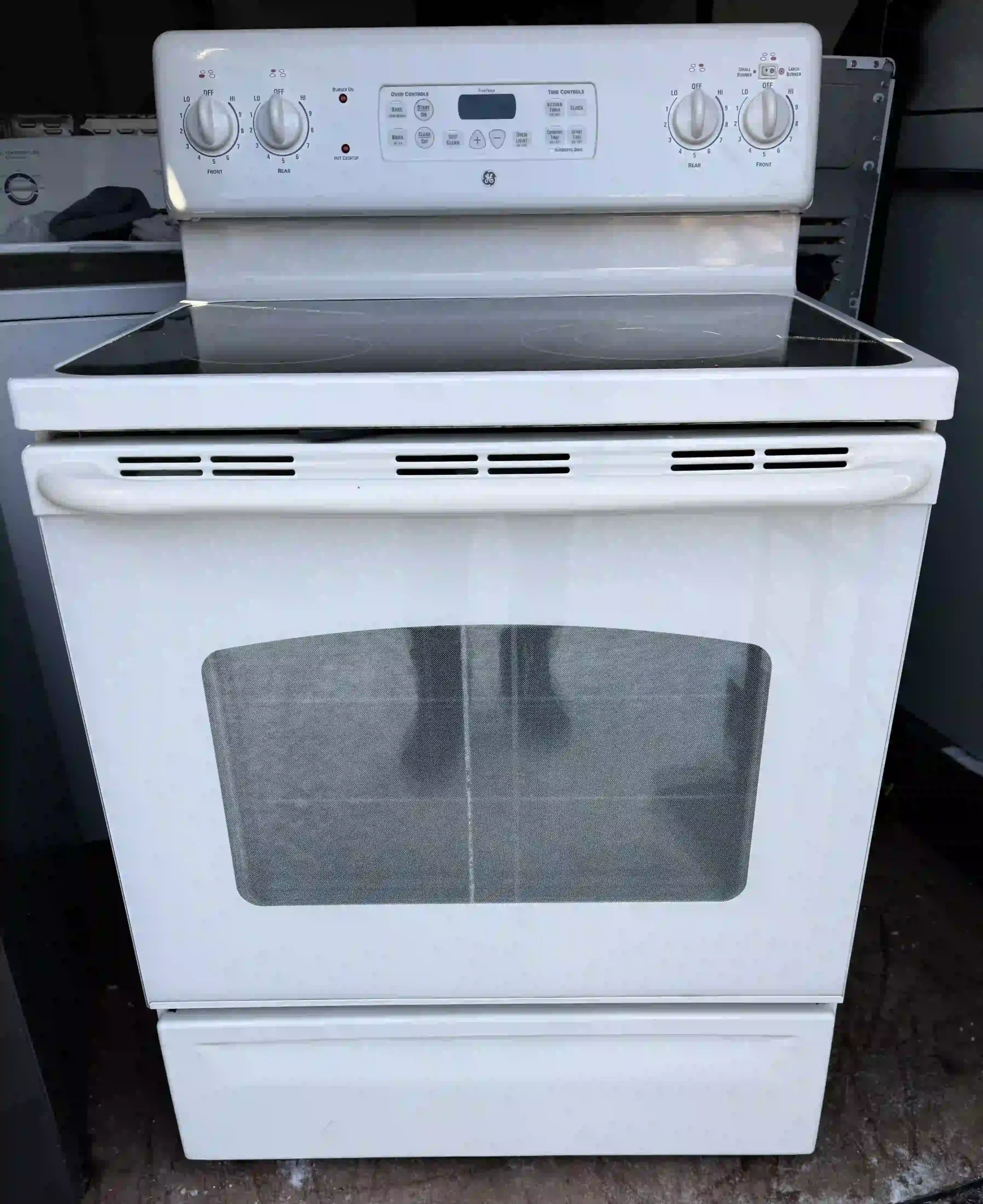 Clean, fully tested GE smooth-top electric range in black finish. This is a dependable everyday stove with fast-heating radiant elements and a spacious oven, perfect for home cooking or rental properties.