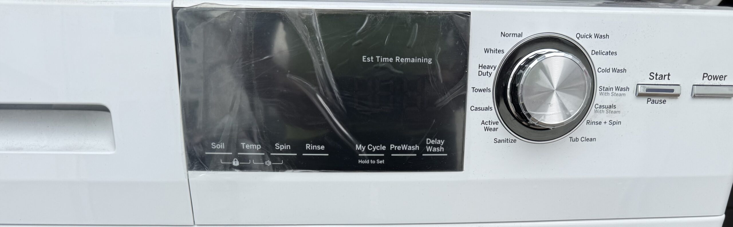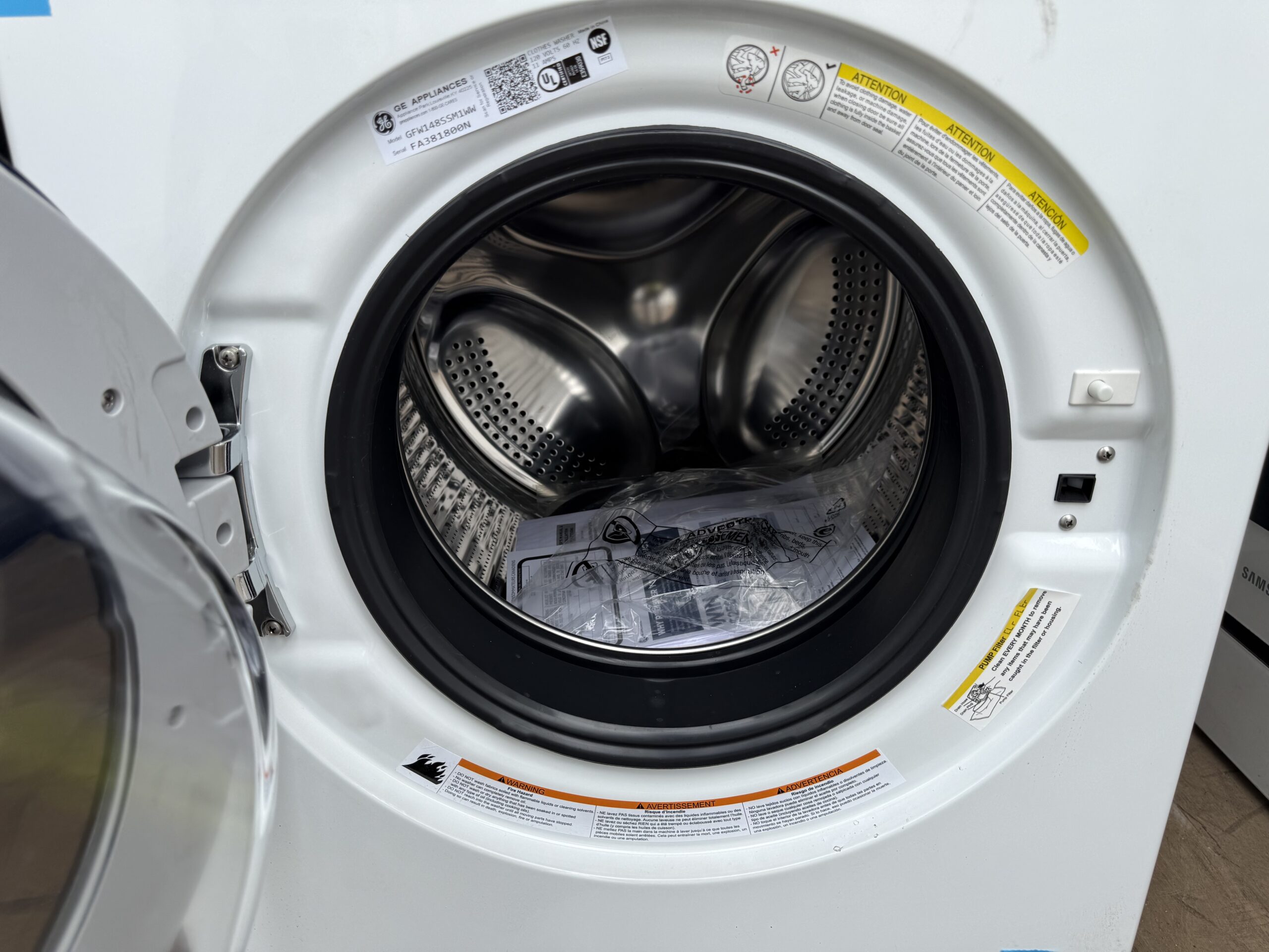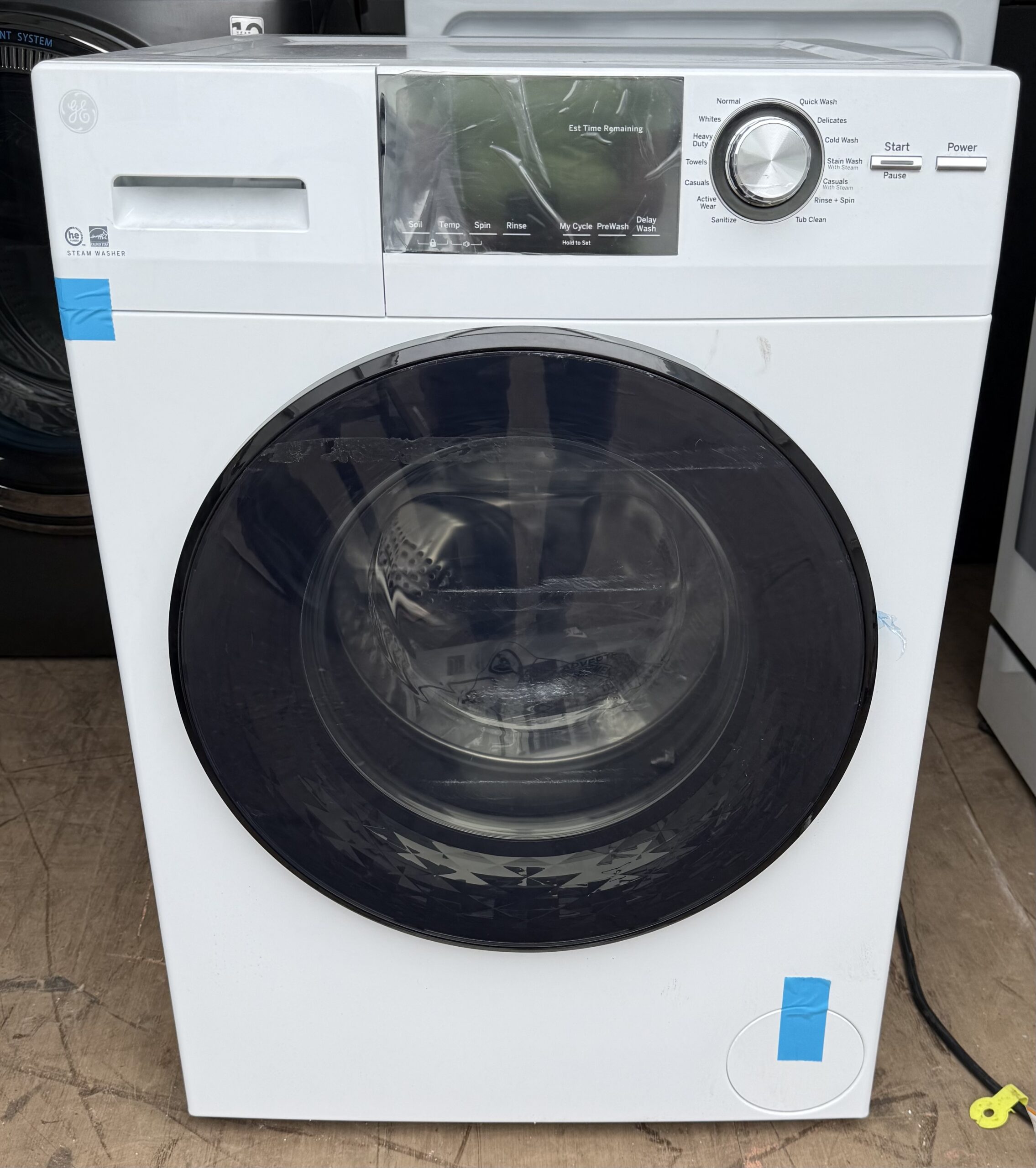 Compact, modern GE front load washer in excellent condition. This unit presents like new and still has original protective film in place, showing minimal to no prior use.