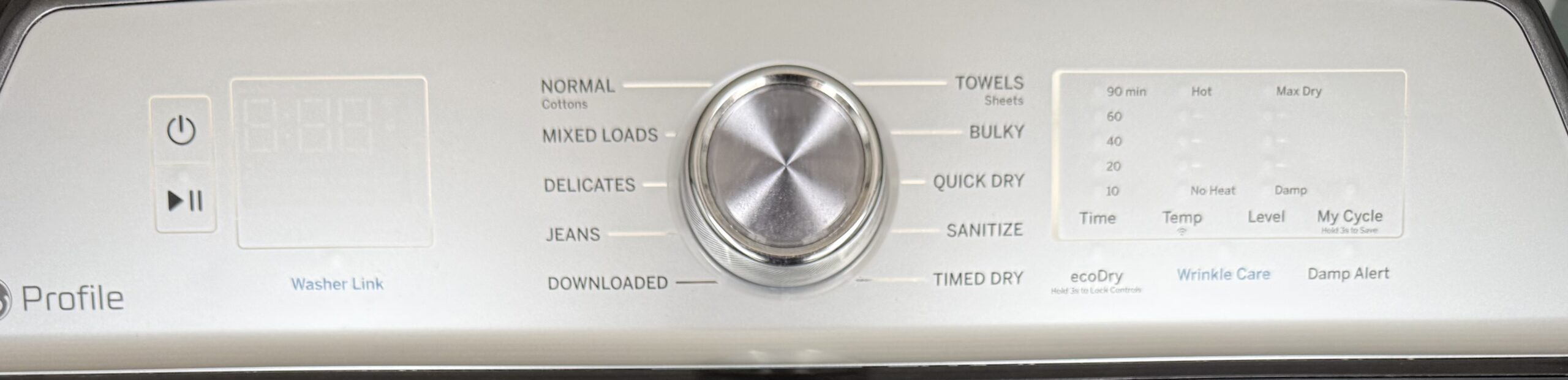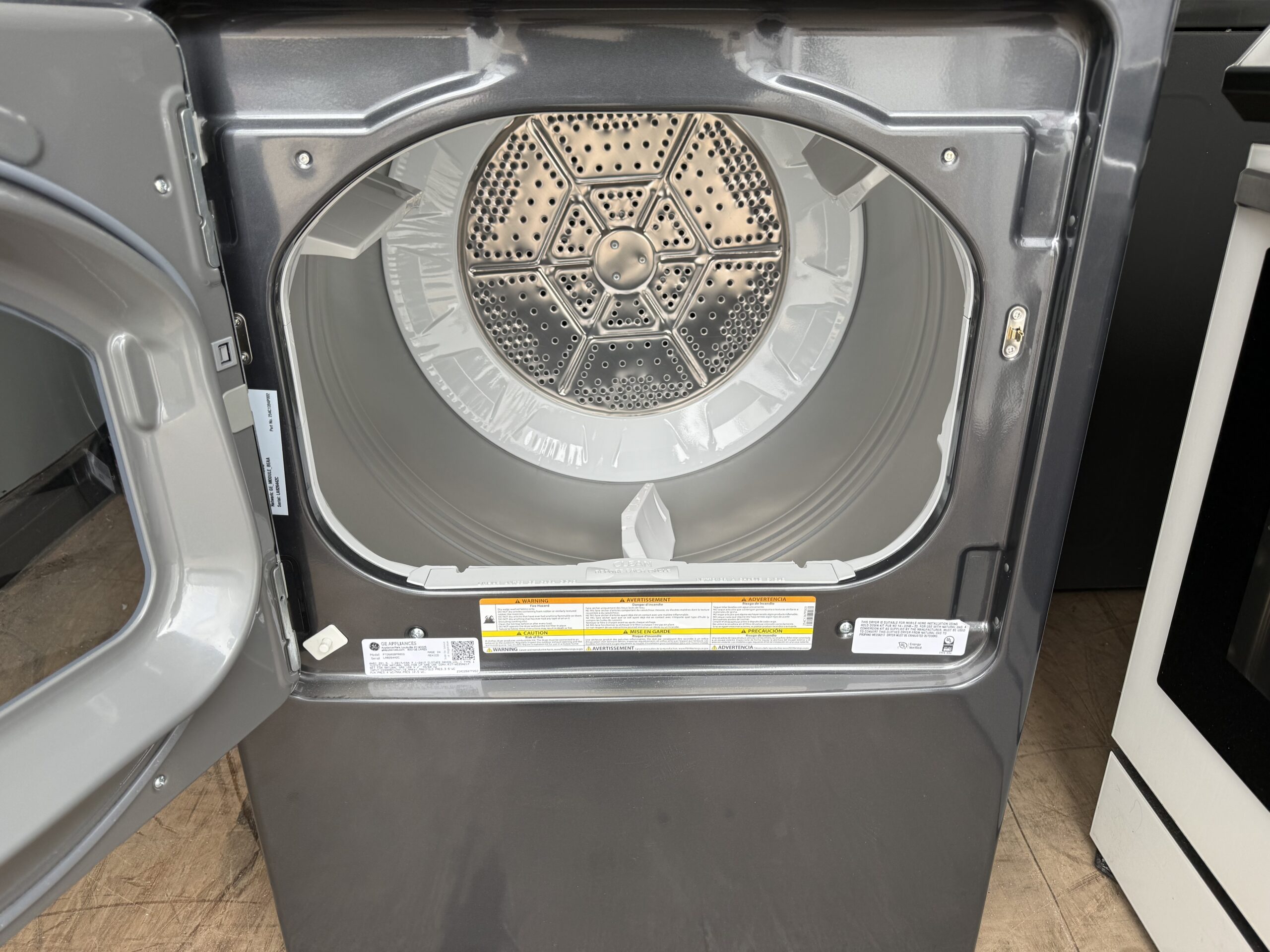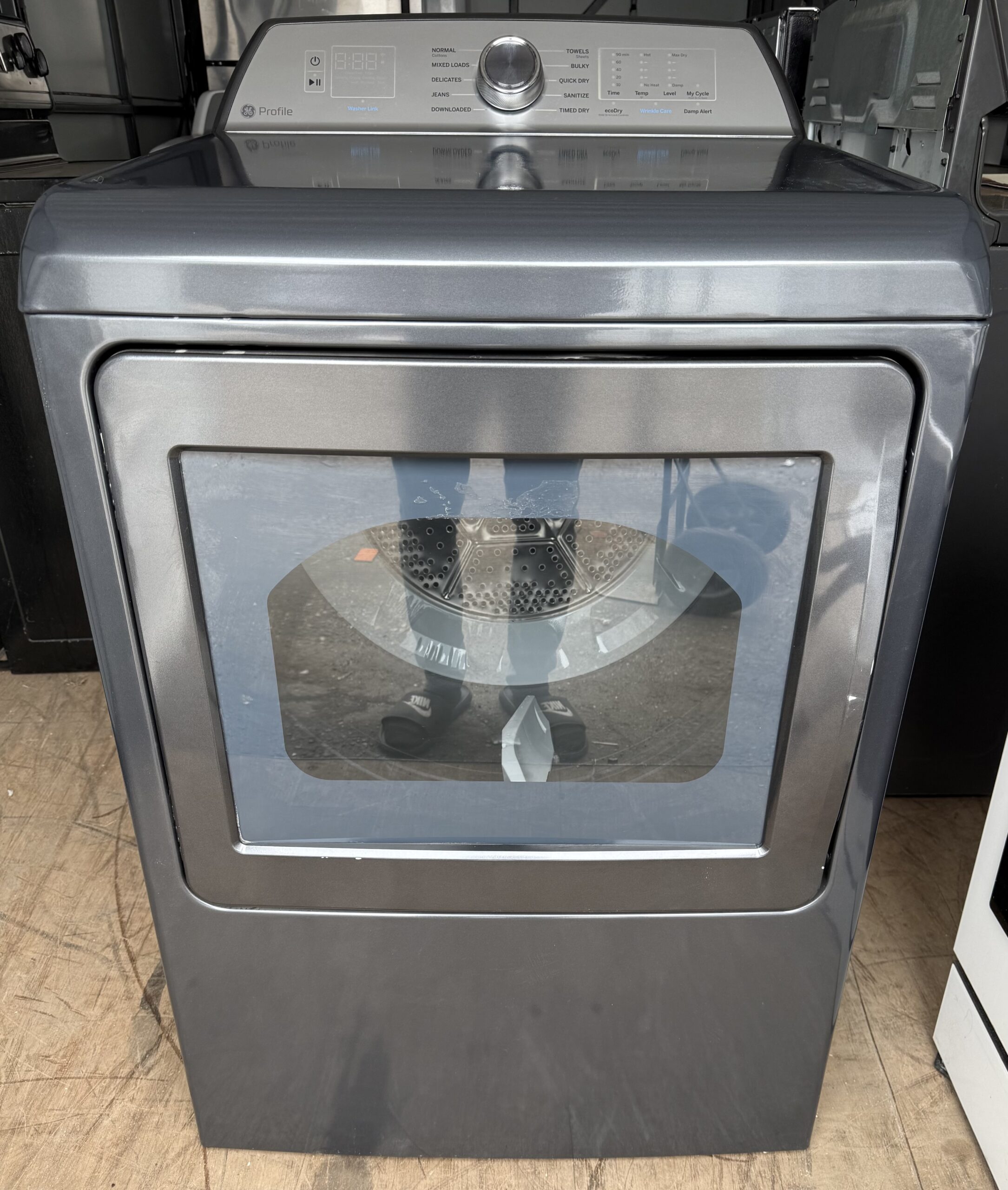 Modern GE Profile gas dryer in a sharp dark stainless finish. High-end look with advanced features and large capacity for handling bigger loads easily.
