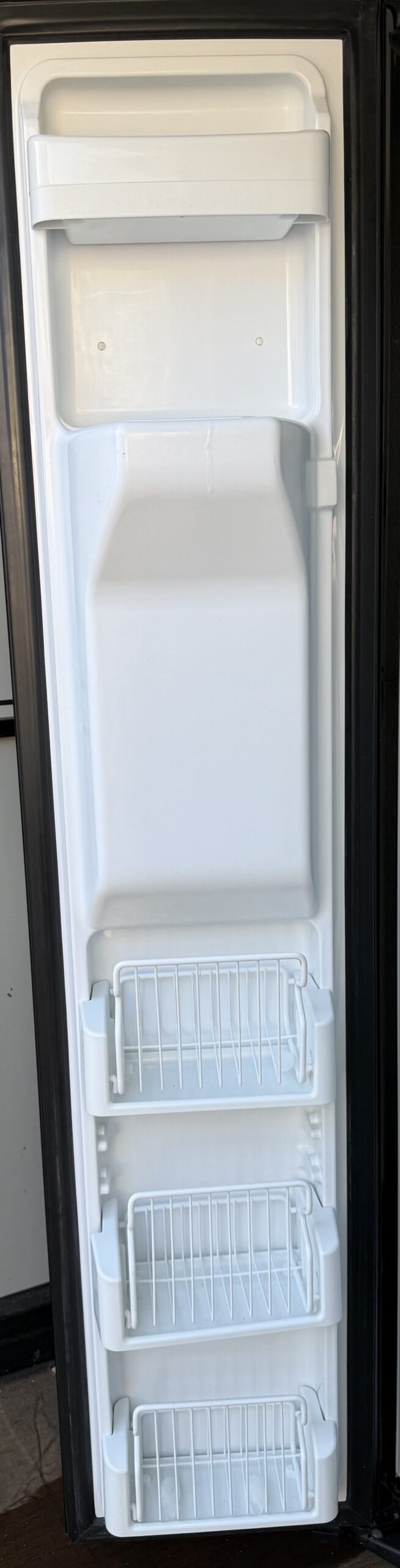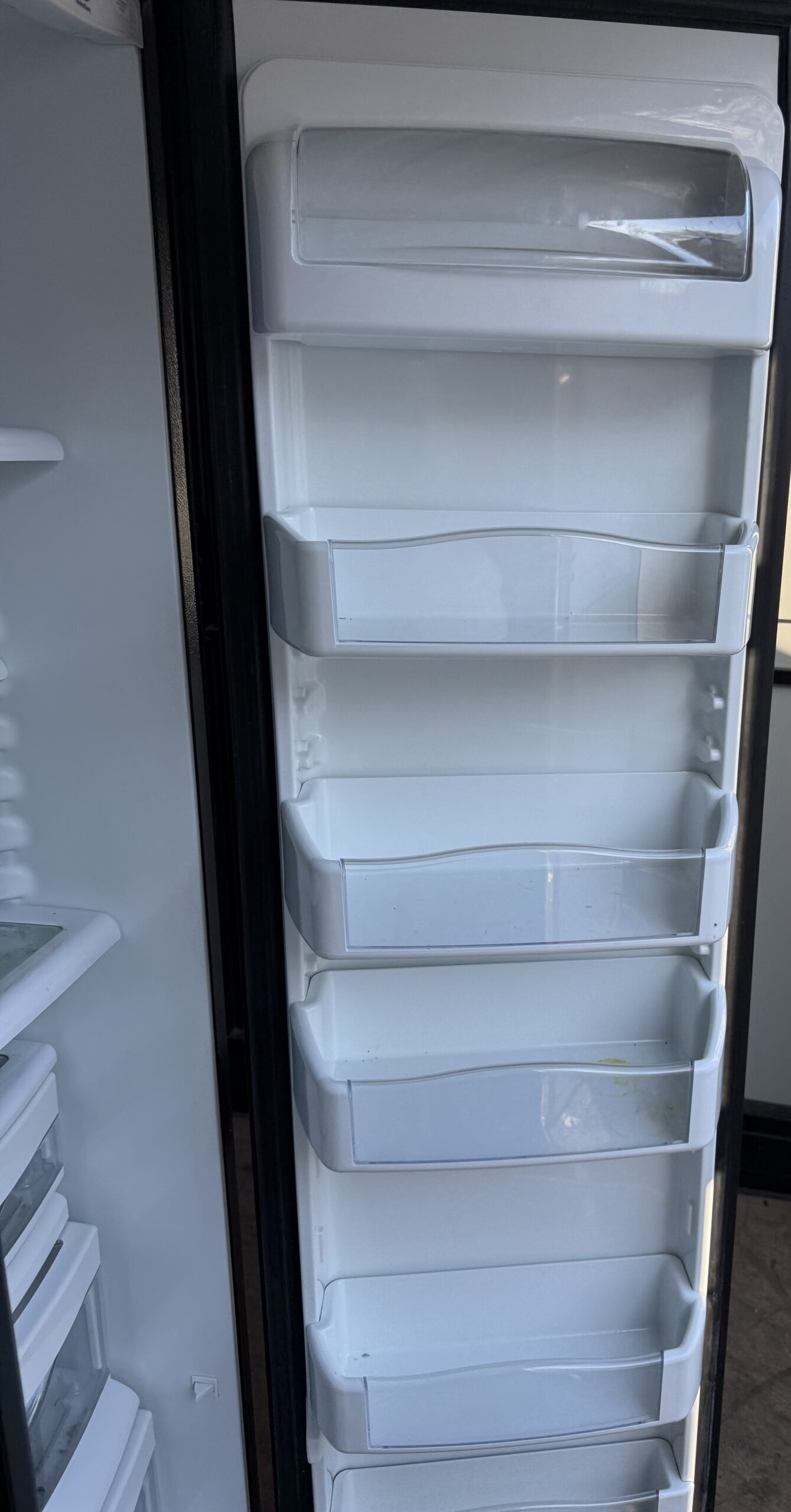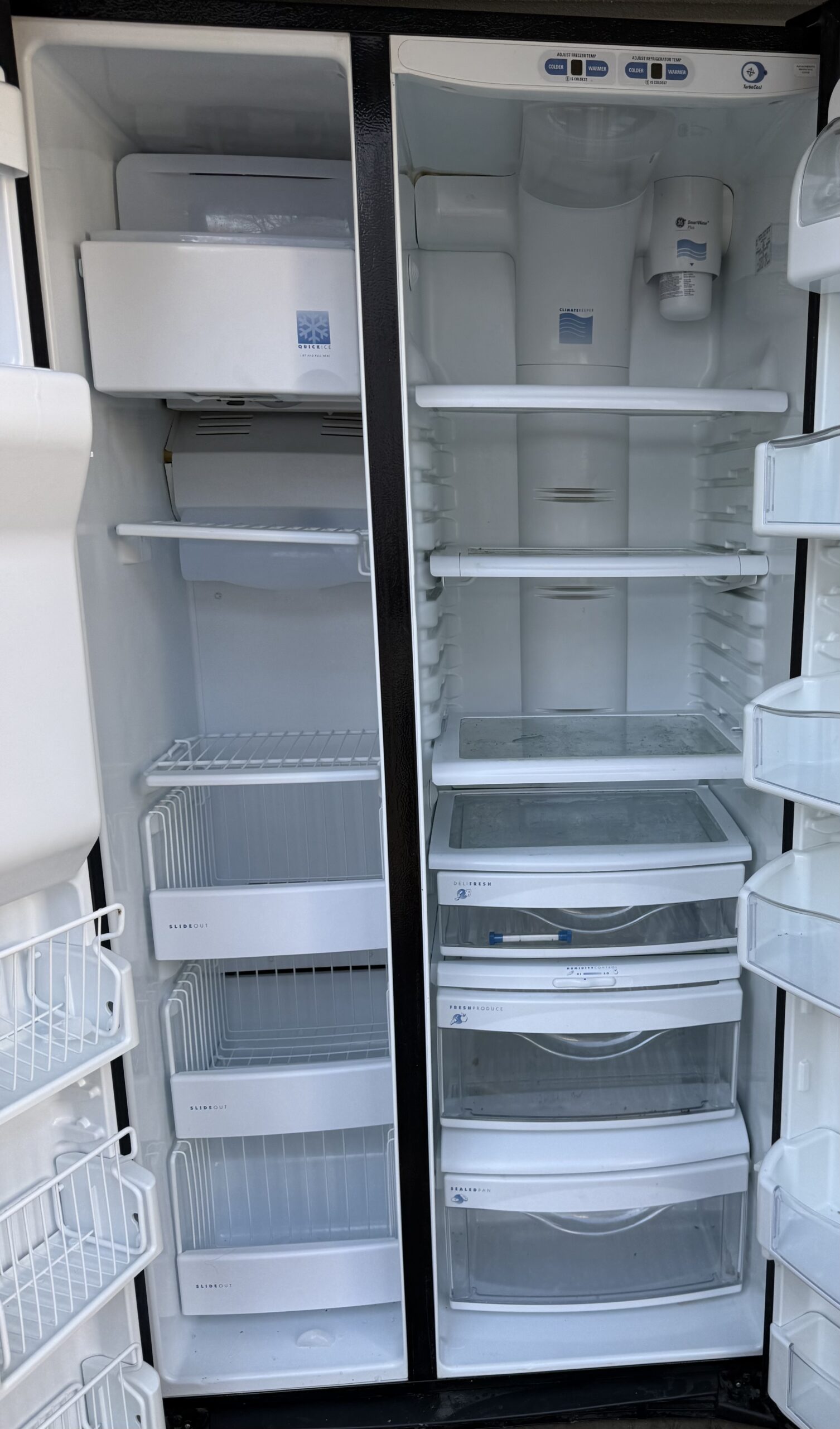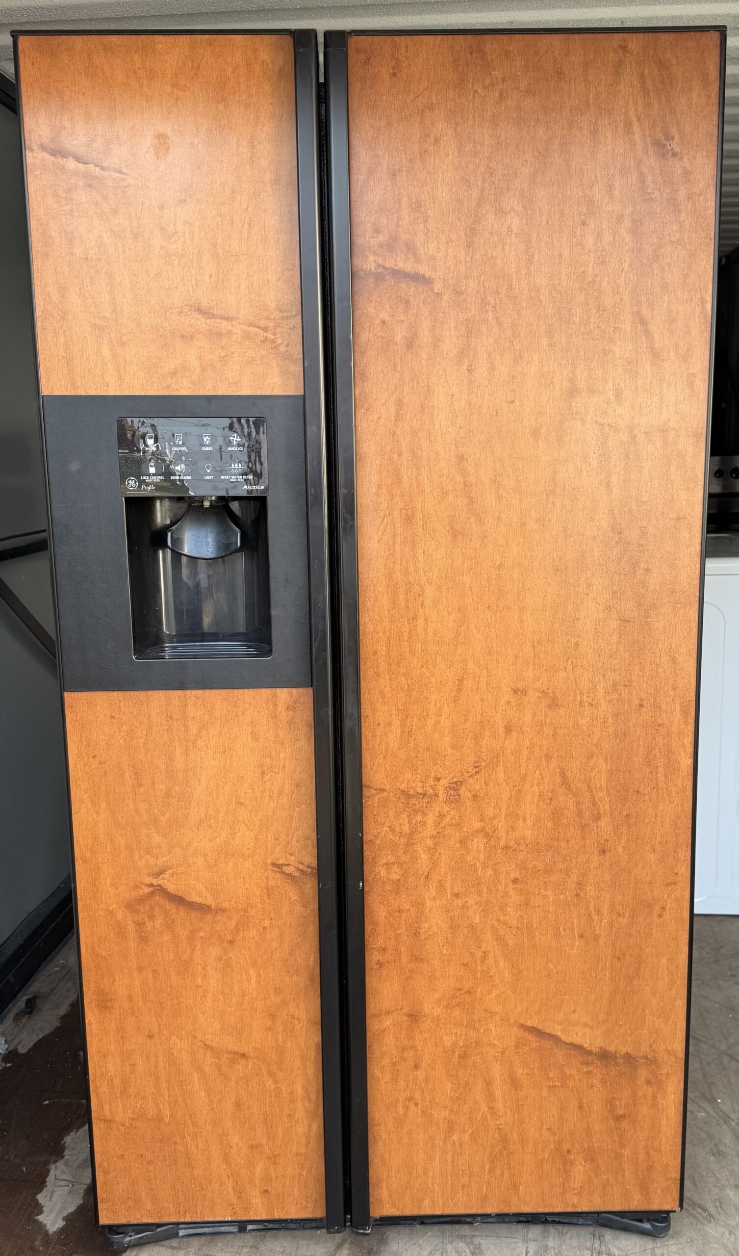 Unique GE side-by-side refrigerator featuring a custom wood panel exterior that gives it a built-in, high-end look. A great fit for someone going for a warm, cabinet-style kitchen aesthetic or wanting something different from standard stainless.