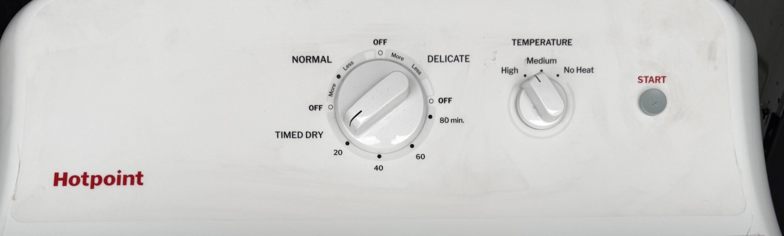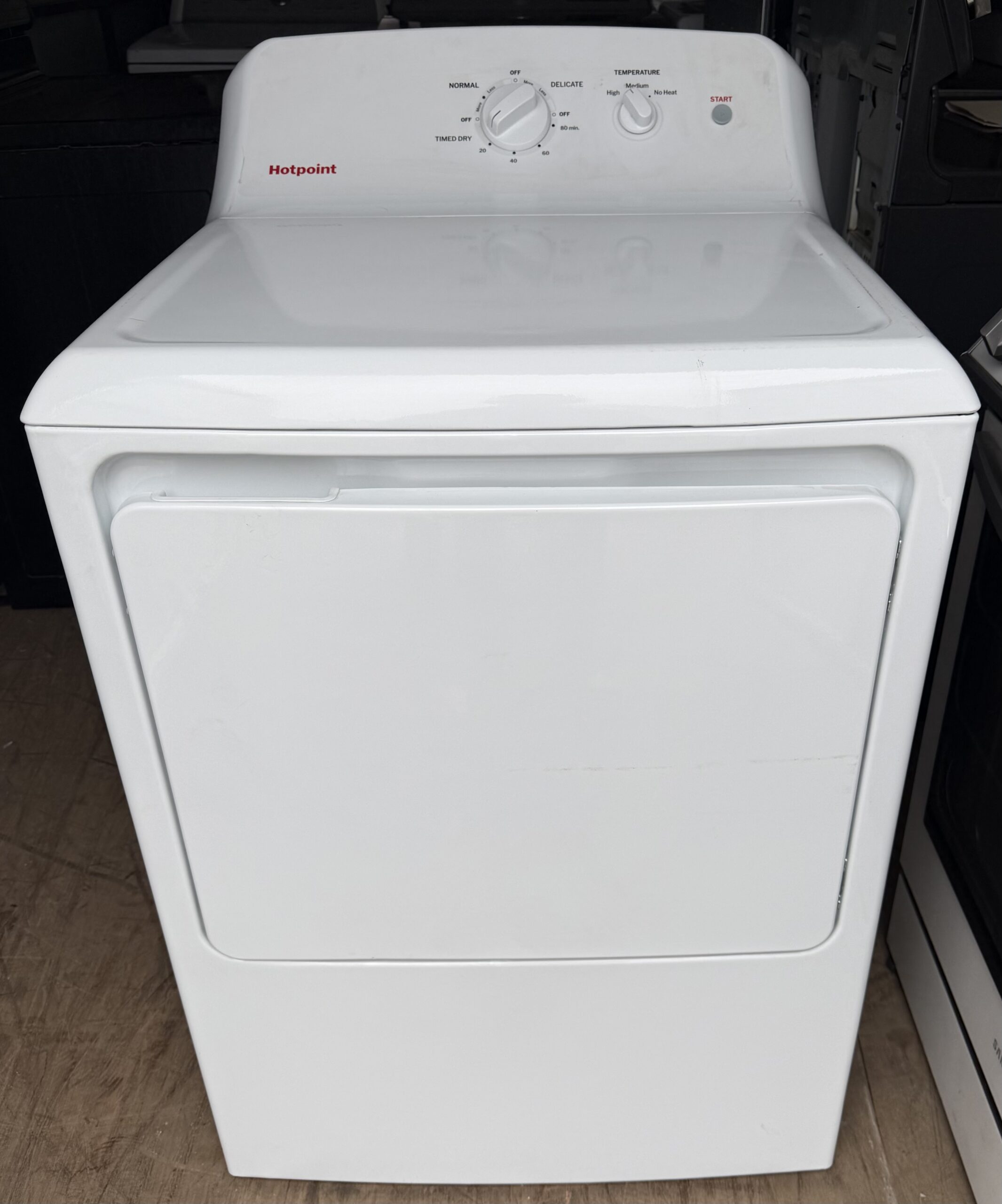 This is a Hotpoint gas dryer in clean condition with a straightforward control layout that’s easy to use. Perfect for someone looking for a solid, no-nonsense machine.