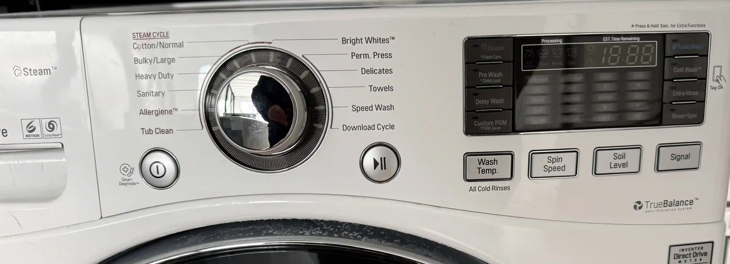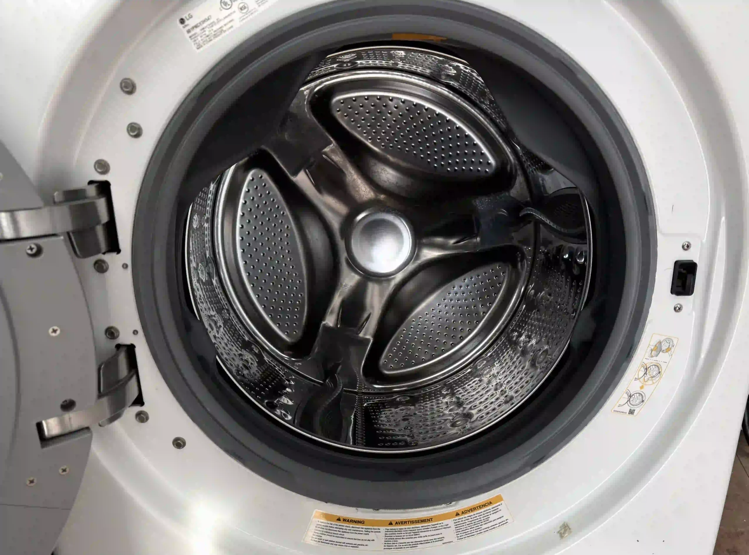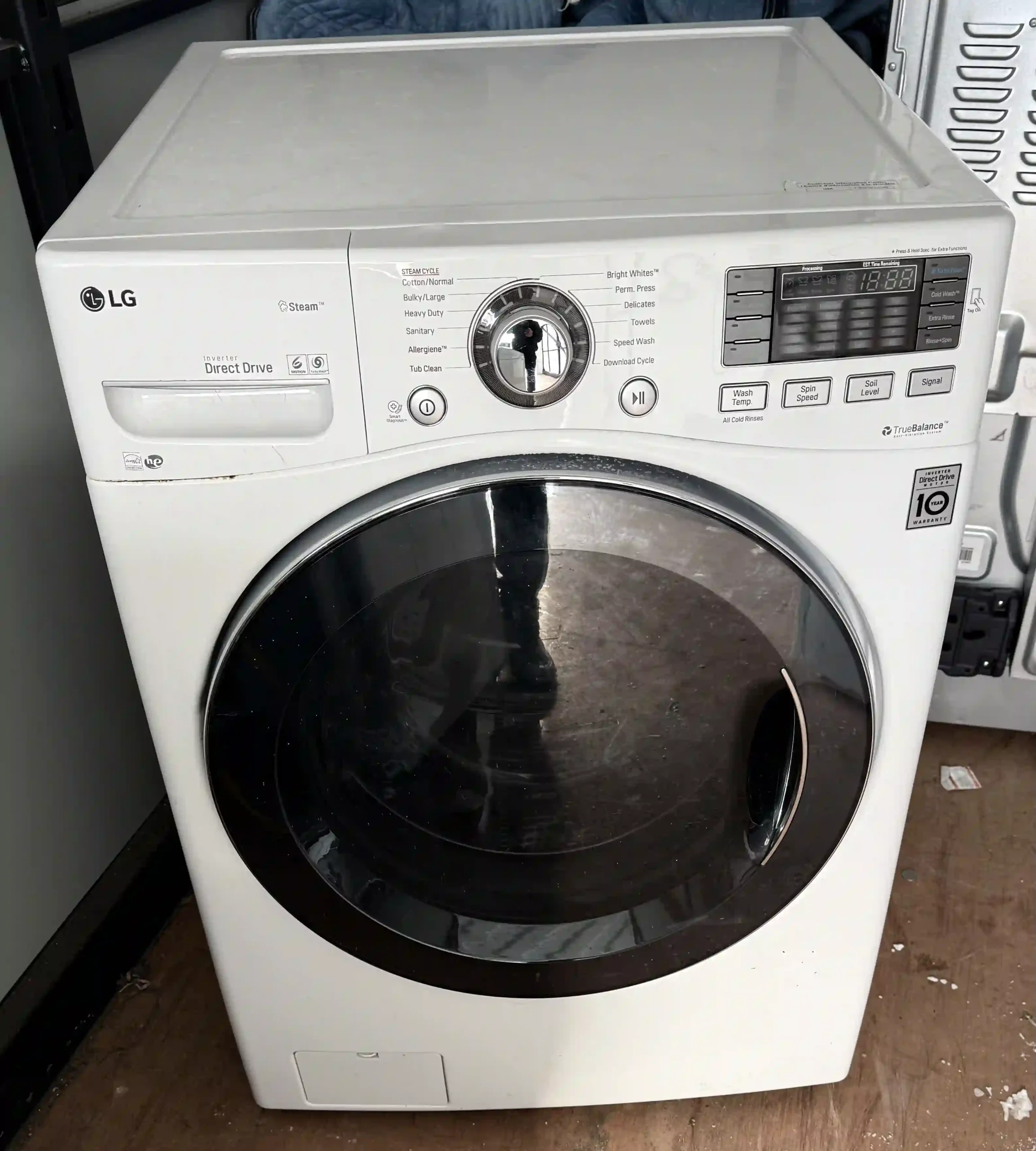 This LG WM3570HWA front-load washer offers a large 4.5 cubic foot capacity, making it ideal for comforters, bulky bedding, and large family loads. LG front-load machines are known for strong cleaning performance, efficient water usage, and quiet operation thanks to the direct drive motor system.