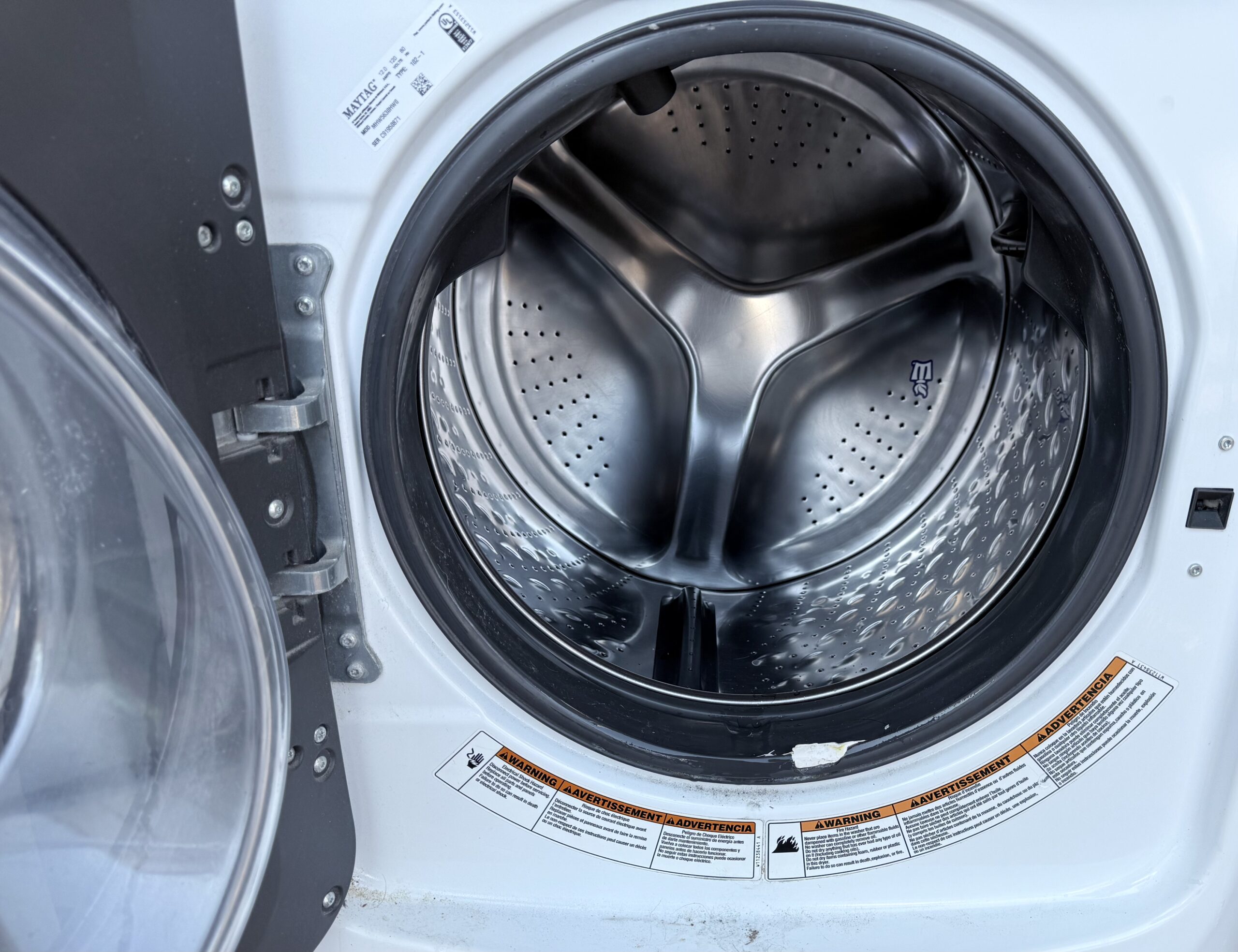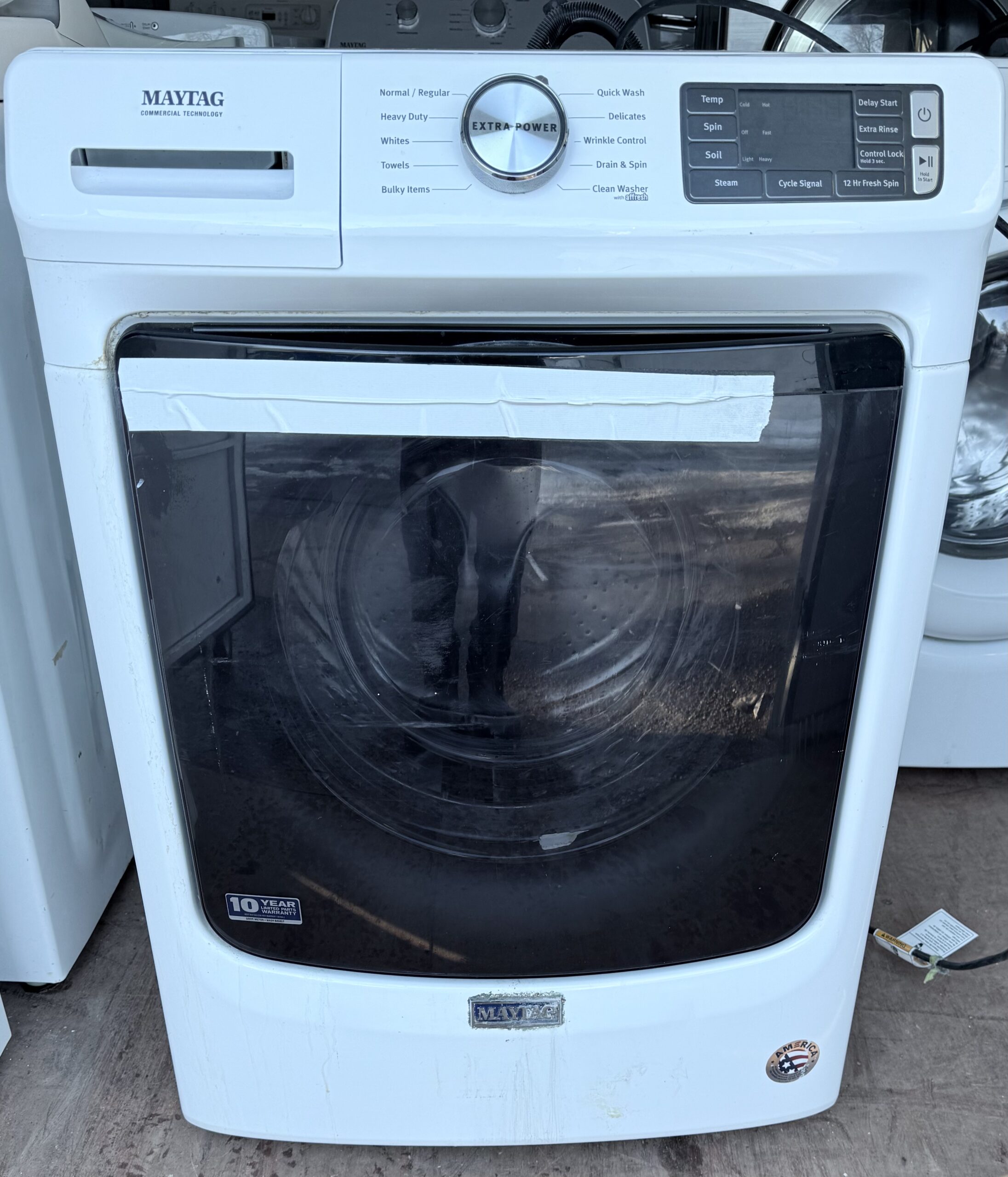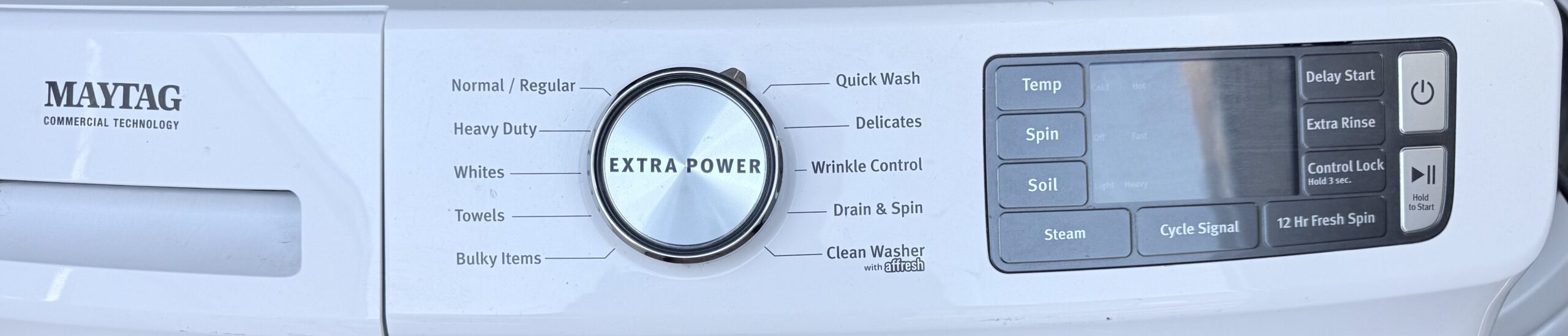 Modern Maytag front-load washer with strong cleaning performance and quiet operation. This is a newer high-efficiency model with the Extra Power wash system and steam cleaning.