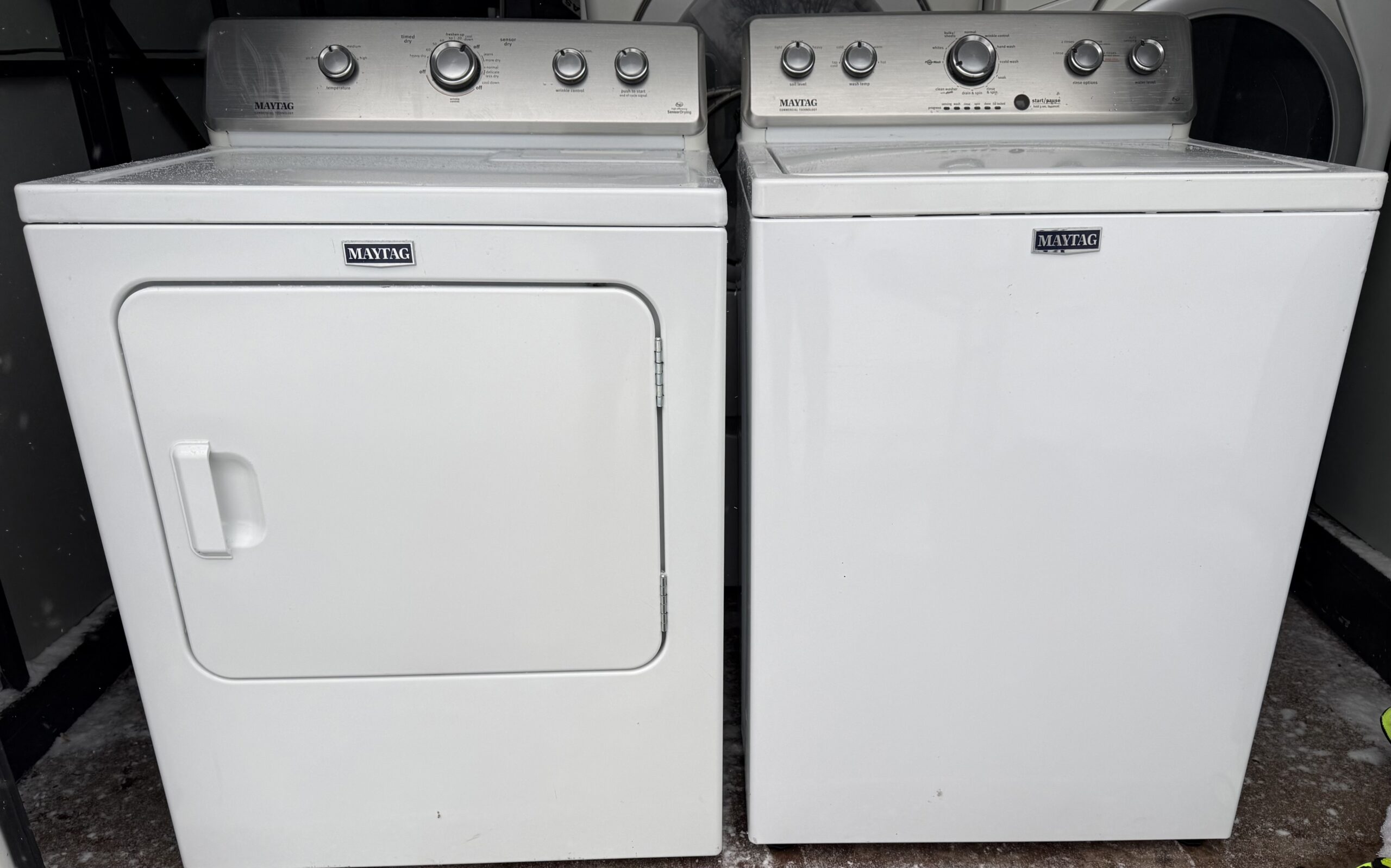 Clean, dependable Maytag washer and dryer set ready for a new home. Maytag is known for building durable laundry machines that last for years, and this matching set is a great choice for anyone who wants reliable performance without paying new-appliance prices.