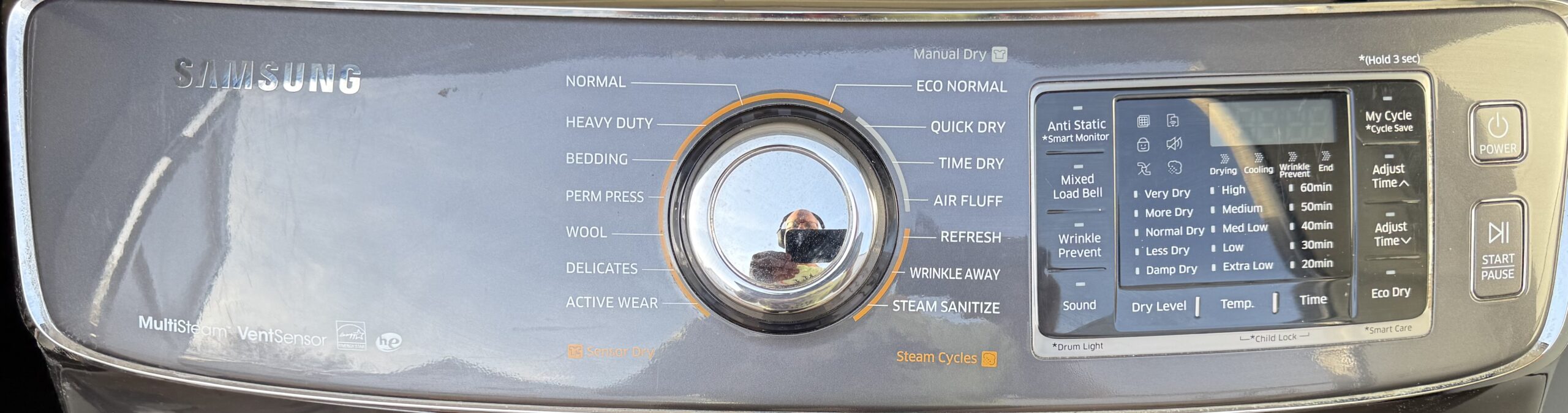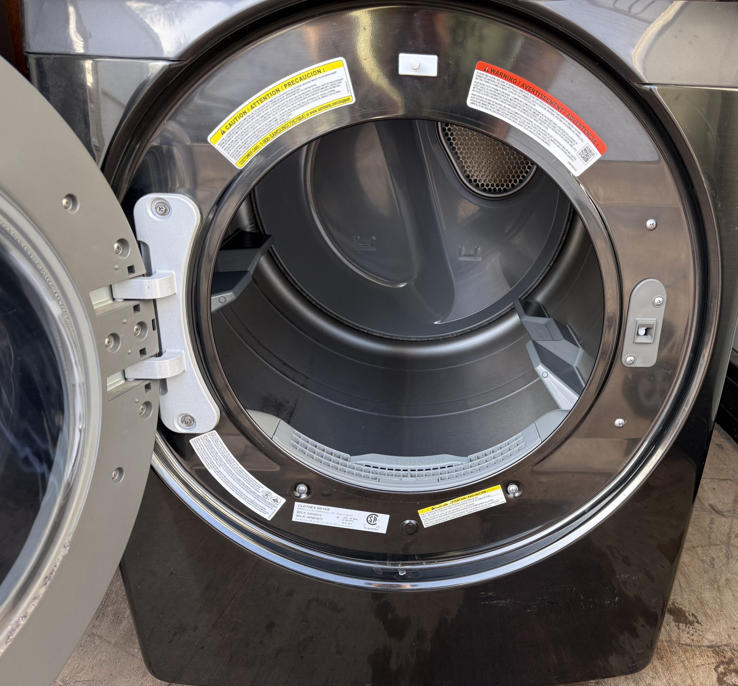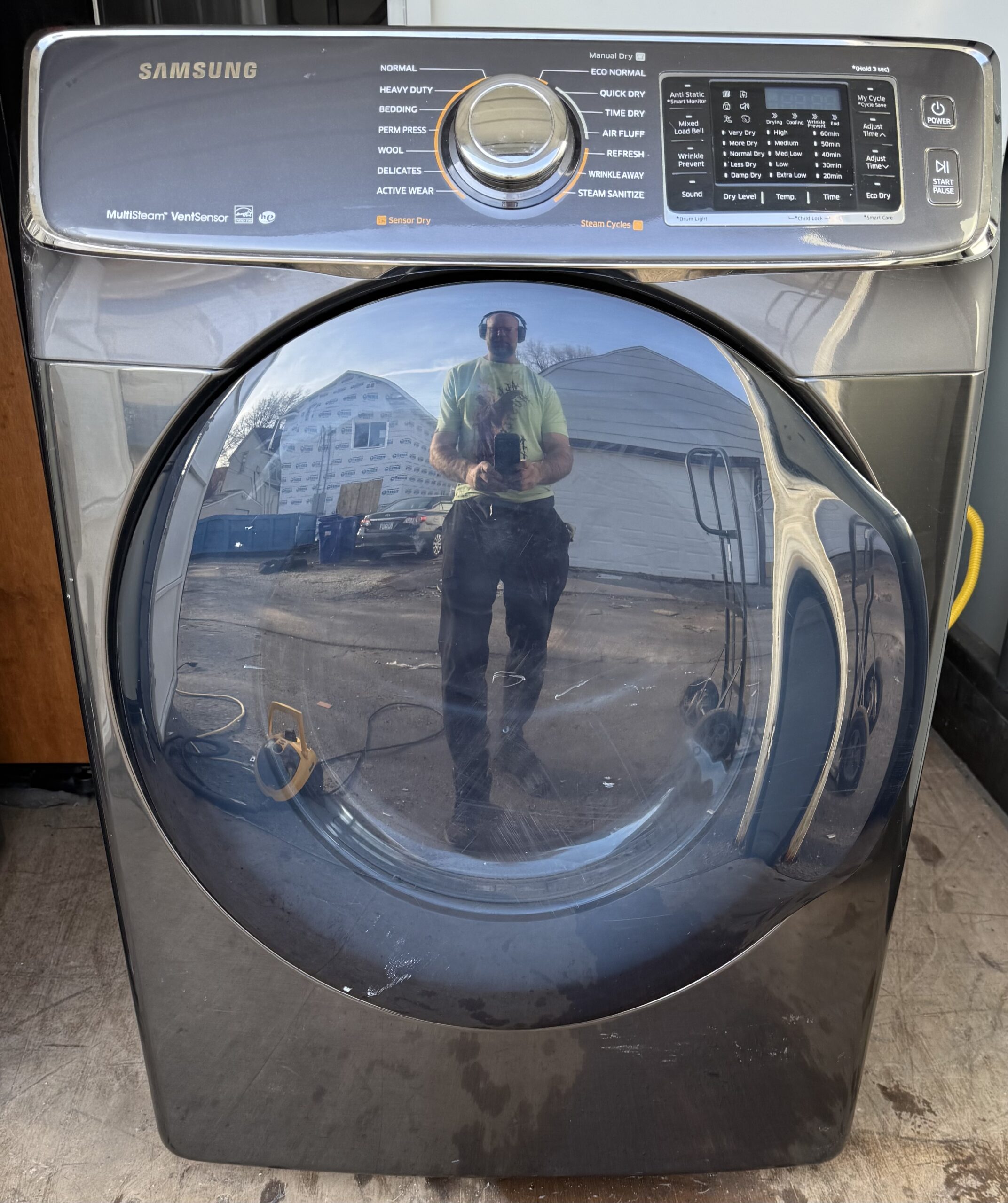 High-capacity Samsung gas dryer with steam functionality, designed for fast, efficient drying and wrinkle reduction. Sleek black stainless finish with modern controls.