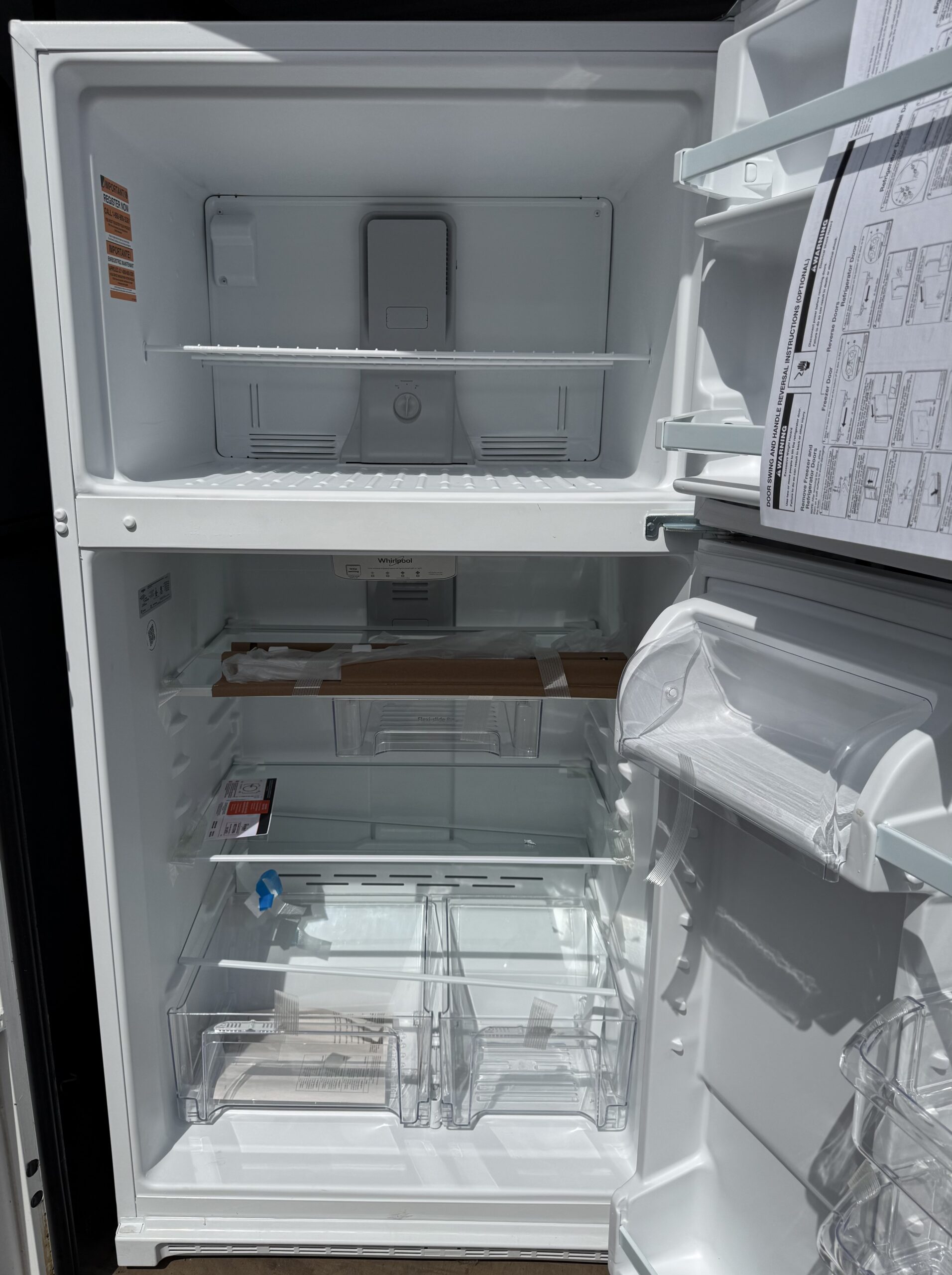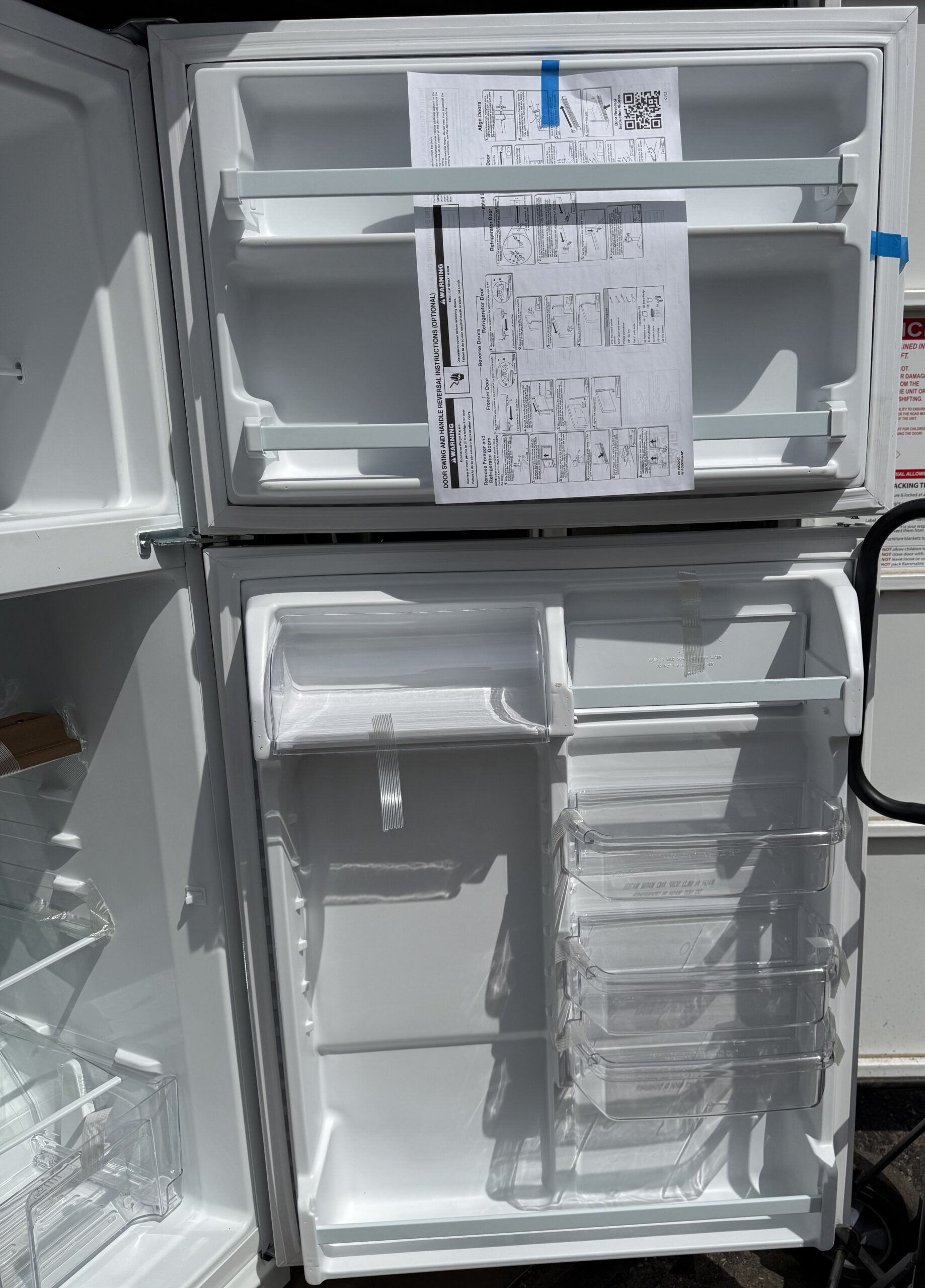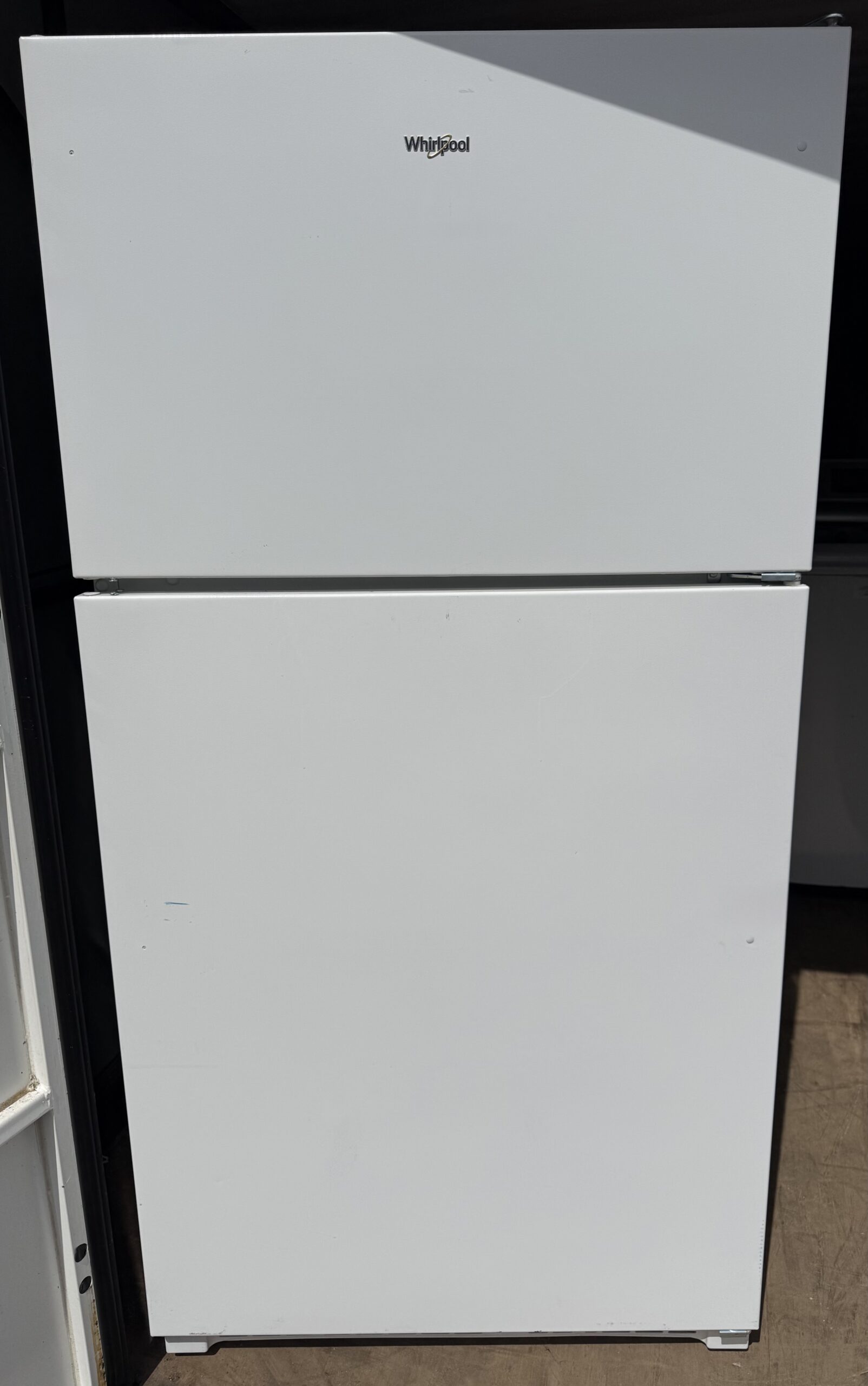 Never used, clean white Whirlpool top freezer refrigerator in excellent condition.