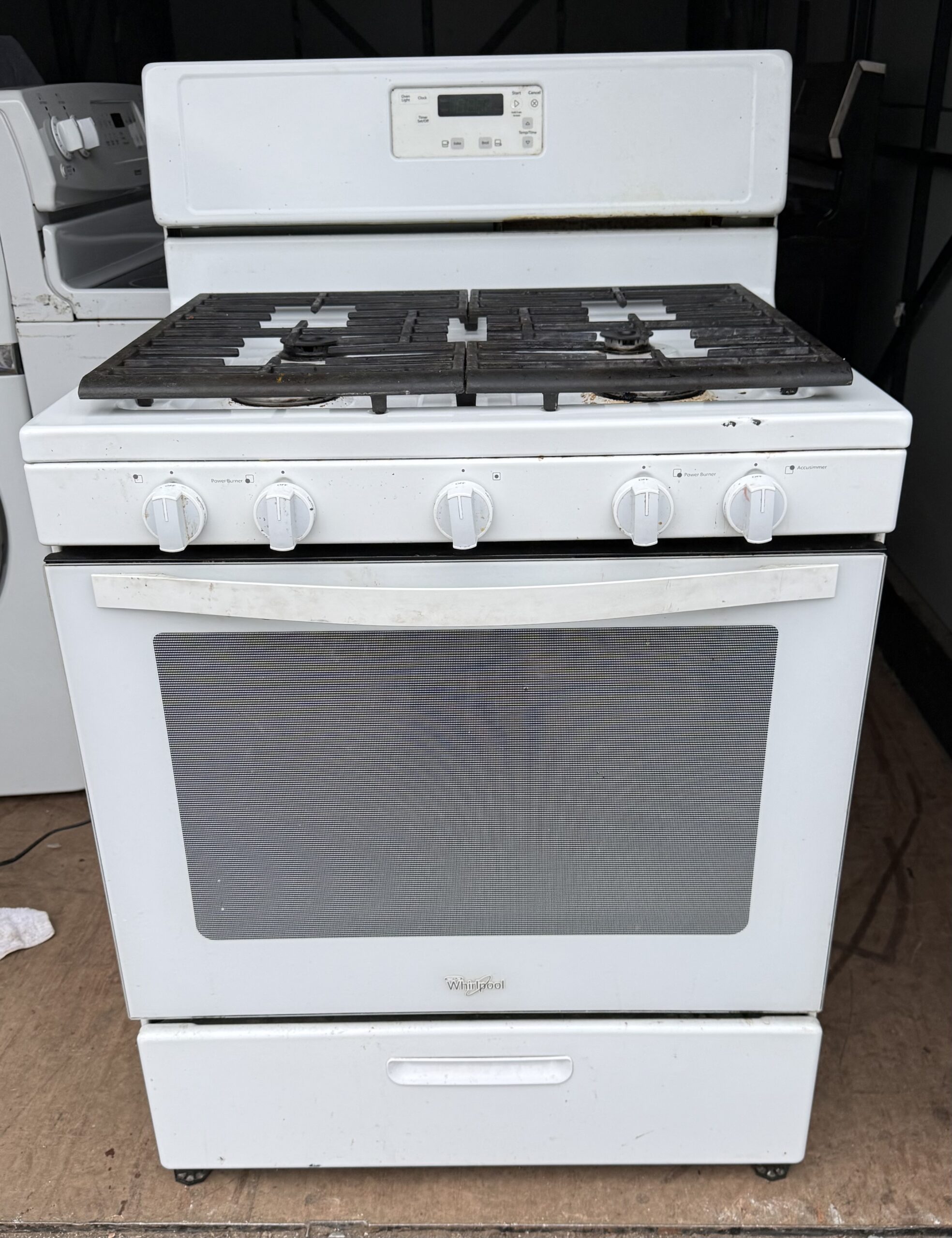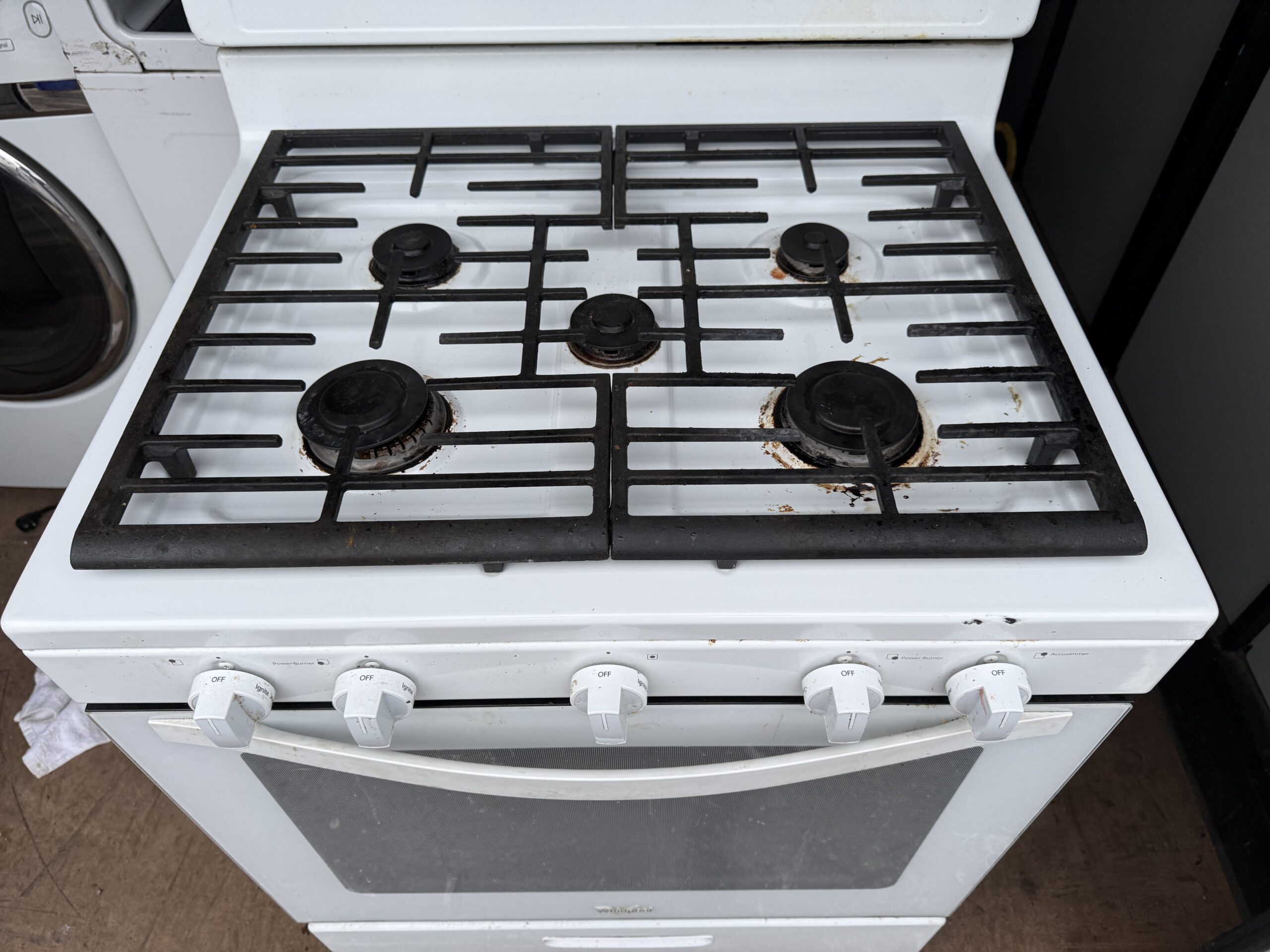 Clean, reliable Whirlpool gas range in white with a modern control panel and large oven window. This is a solid everyday cooking range with five burners including a center burner for added flexibility when cooking multiple dishes.